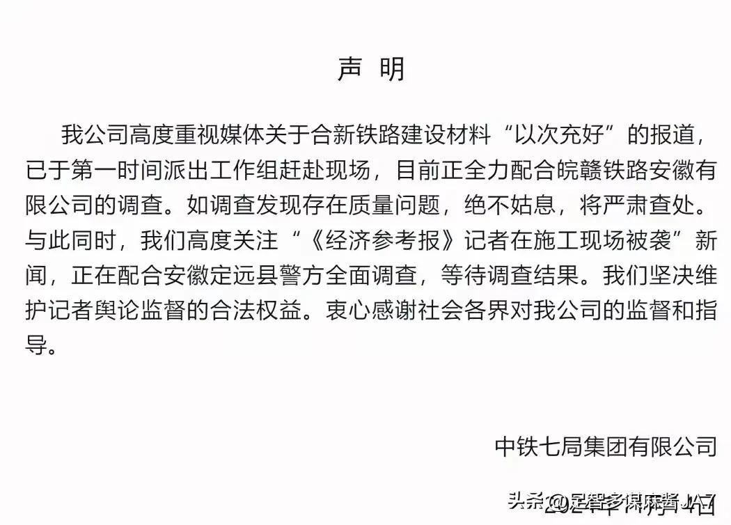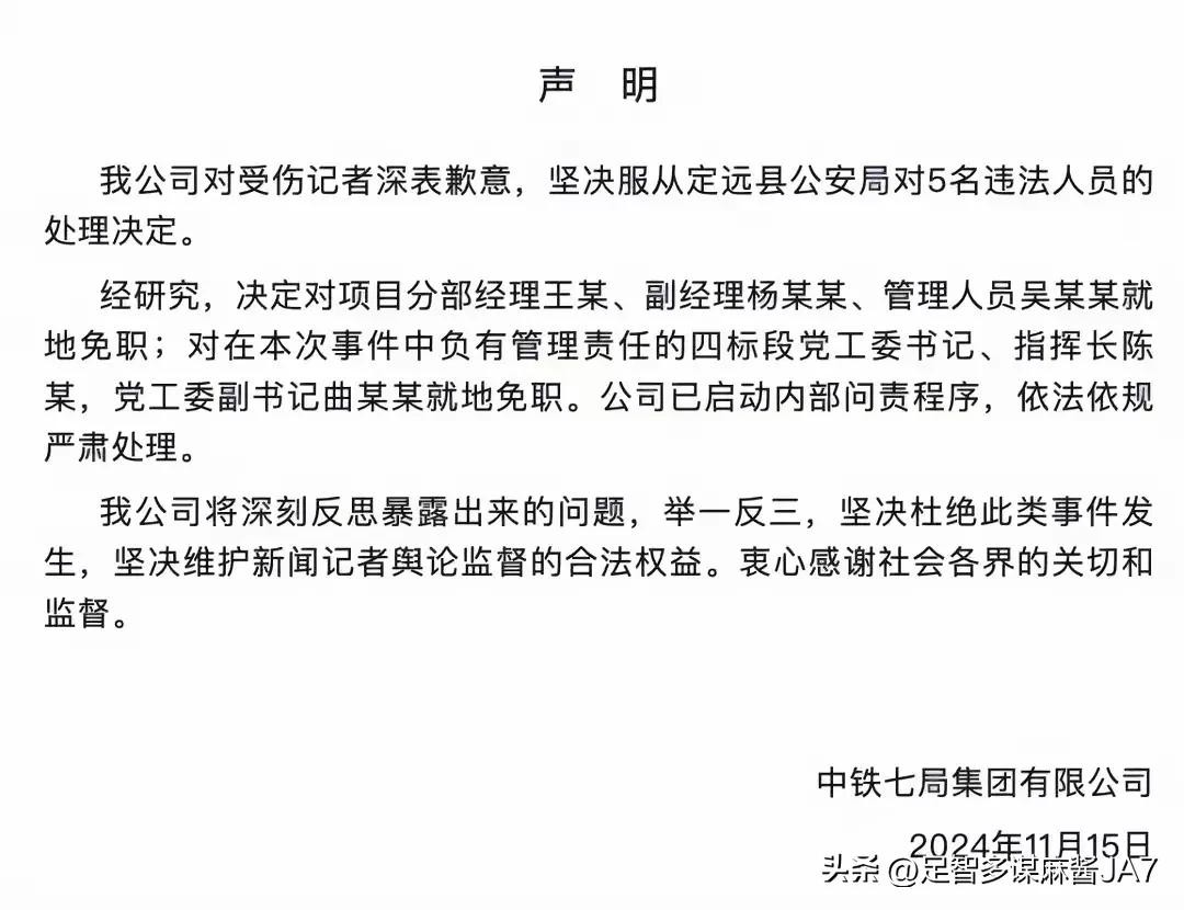 暴力事件后,中铁七局很快发布了道歉声明,对受伤的记者表示了歉意。同时,他们也处理了相关人员,包括项目分部的经理、副经理、管理人员等,他们都被免职了。另外,中铁七局还开始了内部调查,决心找出事情的真相,给公众一个满意的答复。