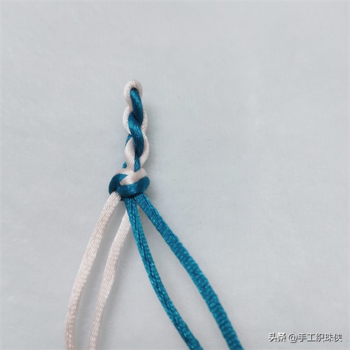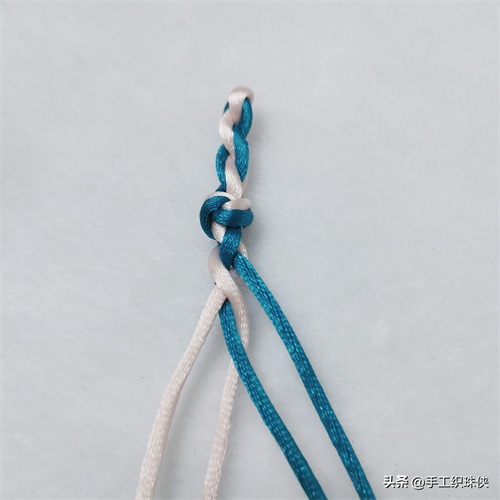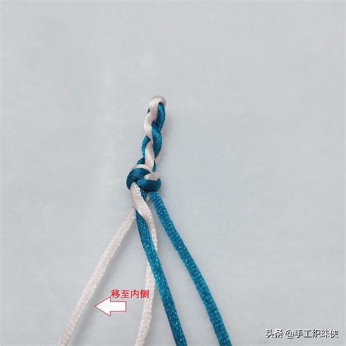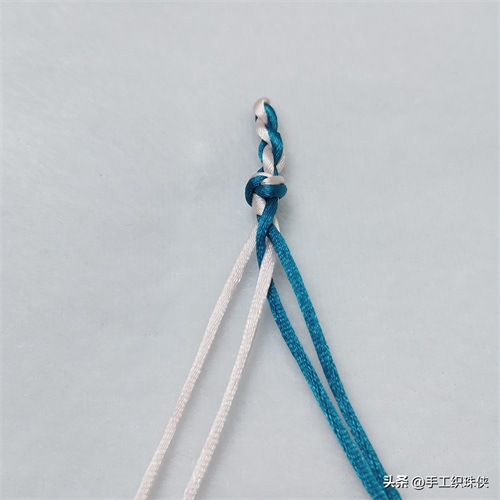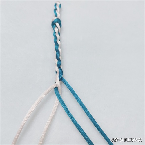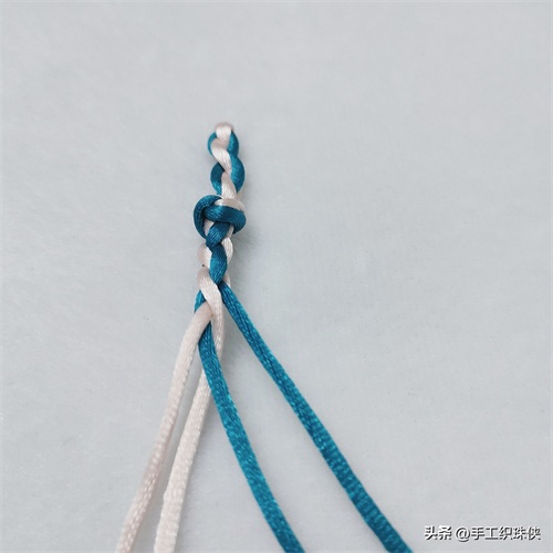 第一步:左边靠外的白色线从上往下穿两蓝色线中间,然后拉回左边放在靠内侧位置。