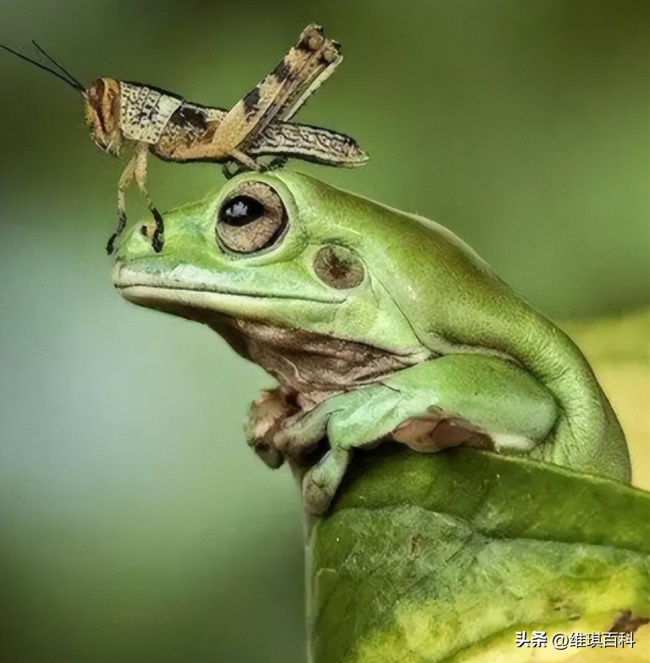 9.这个蚂蚱胆子可太大了,青蛙蓄势待发
