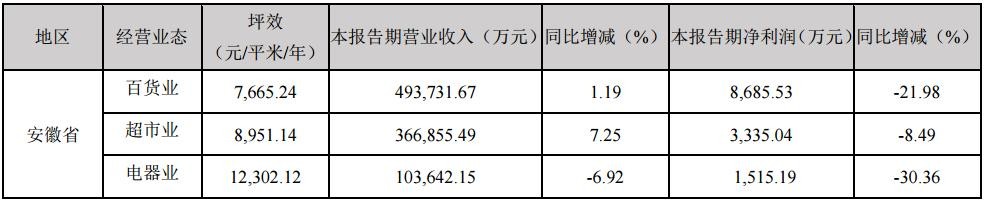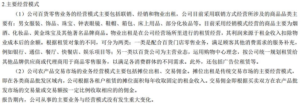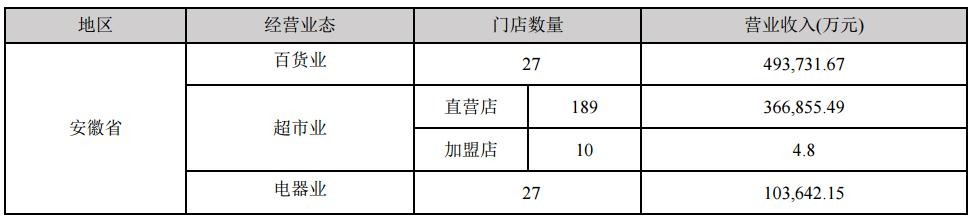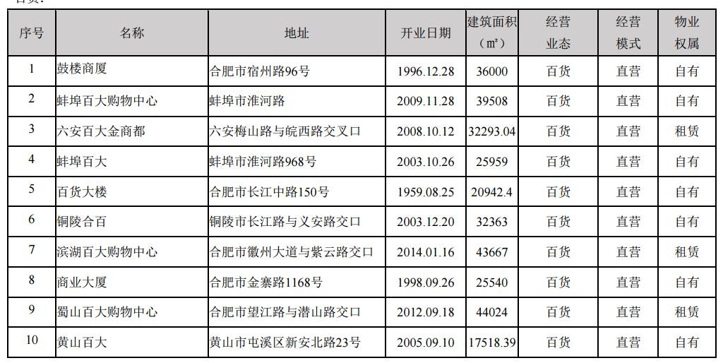 【简 历】公司是安徽省唯一的商业上市公司。公司目前的主营业务为零售业、农产品交易市场两大类业务。公司零售业包括百货、家电、超市连锁、电子商务等细分业态。公司百货、家电、超市三业态共有253家实体经营门店,均占据安徽省多个城市的核心商圈、次商圈的有利位置,作为安徽区域市场的零售龙头企业,公司已经初步构建形成立足省会、辐射全省的连锁网络体系。公司农产品交易市场业务主要通过旗下控股子公司合肥周谷堆农产品批发市场股份有限公司和全资子公司宿州百大农产品物流有限责任公司经营,由周谷堆农批市场投资建设的周谷堆(大兴)新市场于2015年6月底完成主体交易区建设并顺利完成老市场搬迁与开业运营。周谷堆农产品批发市场为综合型农产品批发市场,是安徽省规模最大的农产品集散中心,是国家发改委、商务部、农业部重点支持的全国定点市场之一。