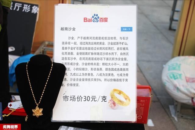 还有的商家,谎称沙金是东南亚国家进口当地的“低含量黄金”,因含金量较低所以才价格便宜。甚至,有篇新闻报道中喜爱戴夸张金饰的越南男子强调沙金拥有和黄金一样的外观,还谎称当地的女性都会佩戴这种金饰。故事讲得有板有眼,其实都是为了欺瞒消费者而编造的噱头而已。
