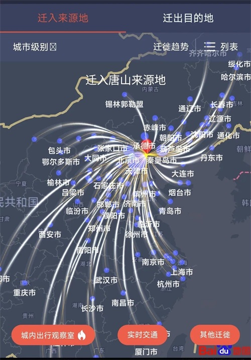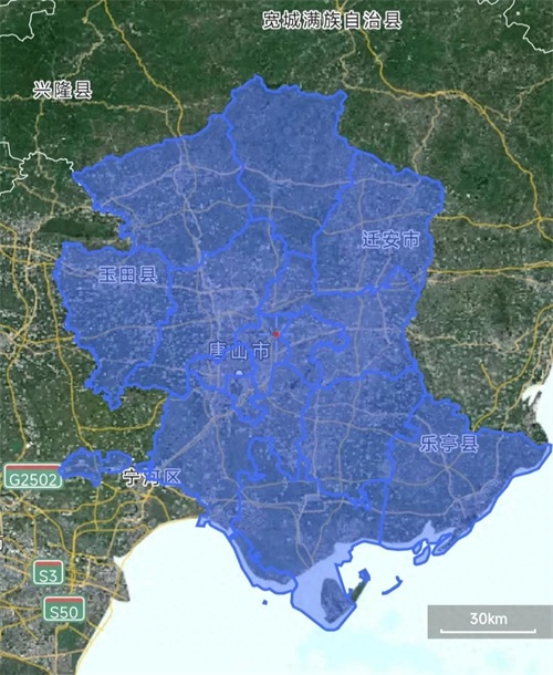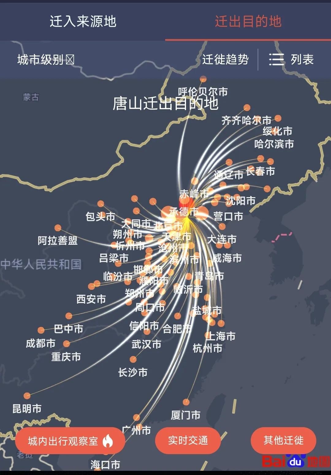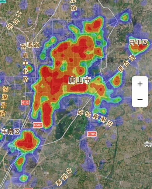 唐山市热力图,所显示,整个唐山市内人员流动频繁。