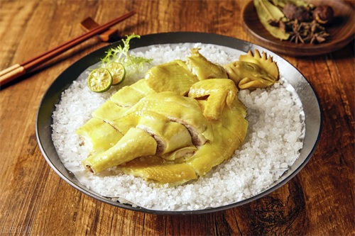盐焗鸡制法独特,味香浓郁,皮爽肉滑。色泽微黄,皮脆肉嫩,骨肉鲜香,风味诱人,是宴会上常用的佳肴