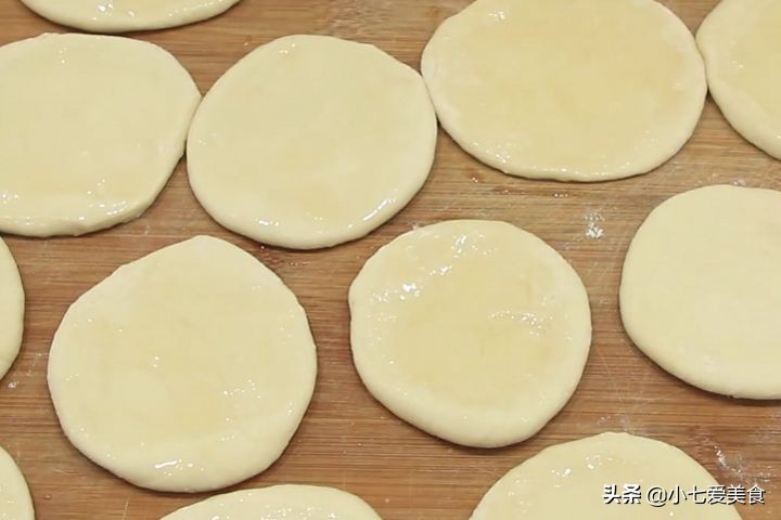 4:将每个小圆球擀成一个小圆饼,在圆饼上边刷上一层植物油在撒上一点干面粉,将2个圆饼合在一块,擀成一个又薄又大的圆饼。