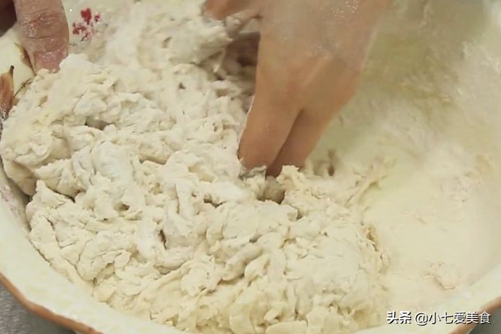 1:准备一个面盆,在面盆里边放上面粉300克、食盐3克搅拌均匀,倒上热水用筷子搅拌成面絮(倒热水的时候,小心别烫到手)。