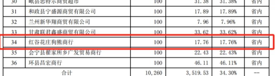 皇台酒业还在回复中详细列示了 2022 年上半年 36 家主要经销商合同执行情况。排名第 34 位的 " 红谷花庄狗熊商行 " 的合同金额为 100 万元,销售金额为 17.76 万元,执行比例为 17.76%。
