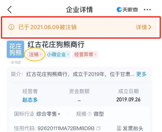 据国家企业信用信息公示系统的数据," 红谷花庄狗熊商行 " 并不存在,与之名称相近的只有 " 红古花庄狗熊商行 "。" 红古花庄狗熊商行 " 位于甘肃省兰州市红古区花庄镇花庄村,2019 年 9 月 26 日注册成立,但已于 2021 年 6 月 9 日注销。
