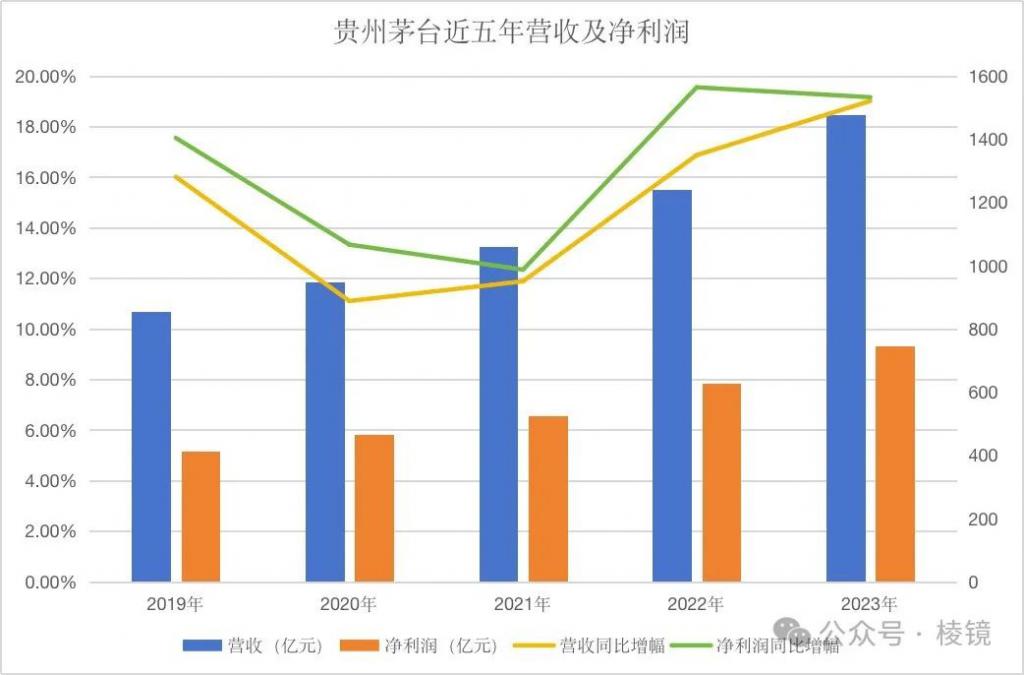 根据贵州茅台近 5 年的经营数据,2020 年以及 2021 年营收增速均为 11% 左右,但 2022 年的营收增速达到 16.87%,净利润增速达到 19.55%。