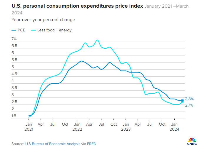 上周五公布的数据显示,美联储首选通胀目标、剔除食物和能源后的 3 月核心 PCE 物价指数同比增速为 2.82%,这是连续第三个月令人失望的报告。在经历了 2023 年下半年的大幅下滑后,降低通胀的进展正停滞不前……