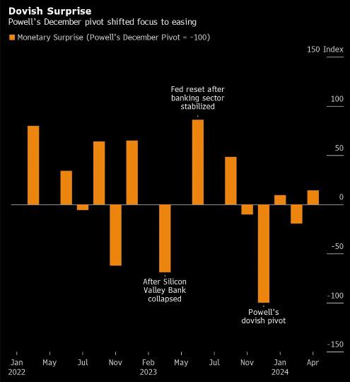 彭博经济研究编制的美联储情绪指数 ( 由基于 60000 多个美联储头条新闻的自然语言处理算法提供支持 ) 显示,鲍威尔在去年 12 月发表了重大的鸽派讲话——通过暗示将更快转向降息,他当时的言论提振了市场并帮助经济摆脱了低迷。但到目前为止,四个月过去了,随着需求的强劲增长和通胀高于目标,鲍威尔可能会被迫做出逆转。