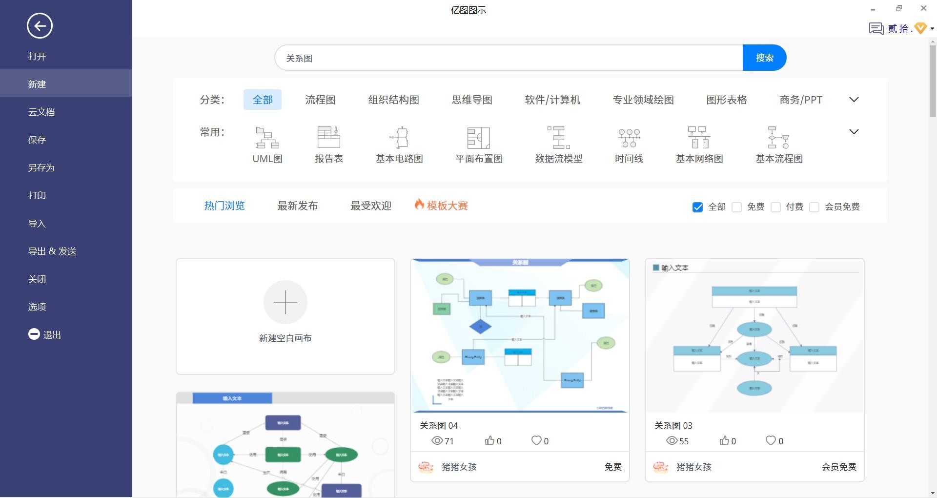第二步:新建关系图。从搜索栏中直接输入“关系图”进行搜索。然后从例子库中,选择符合自己需要的一个模板,点击使用关系图模板。