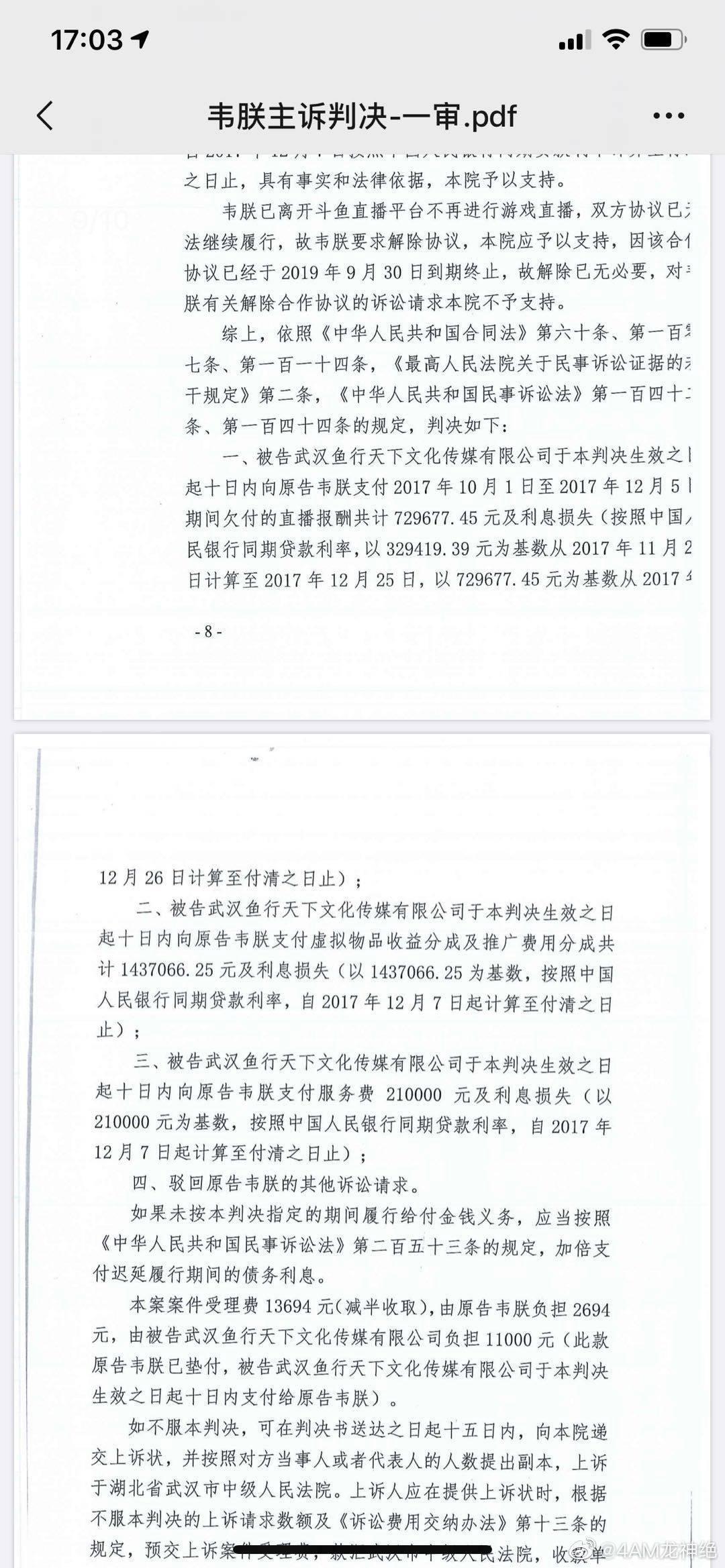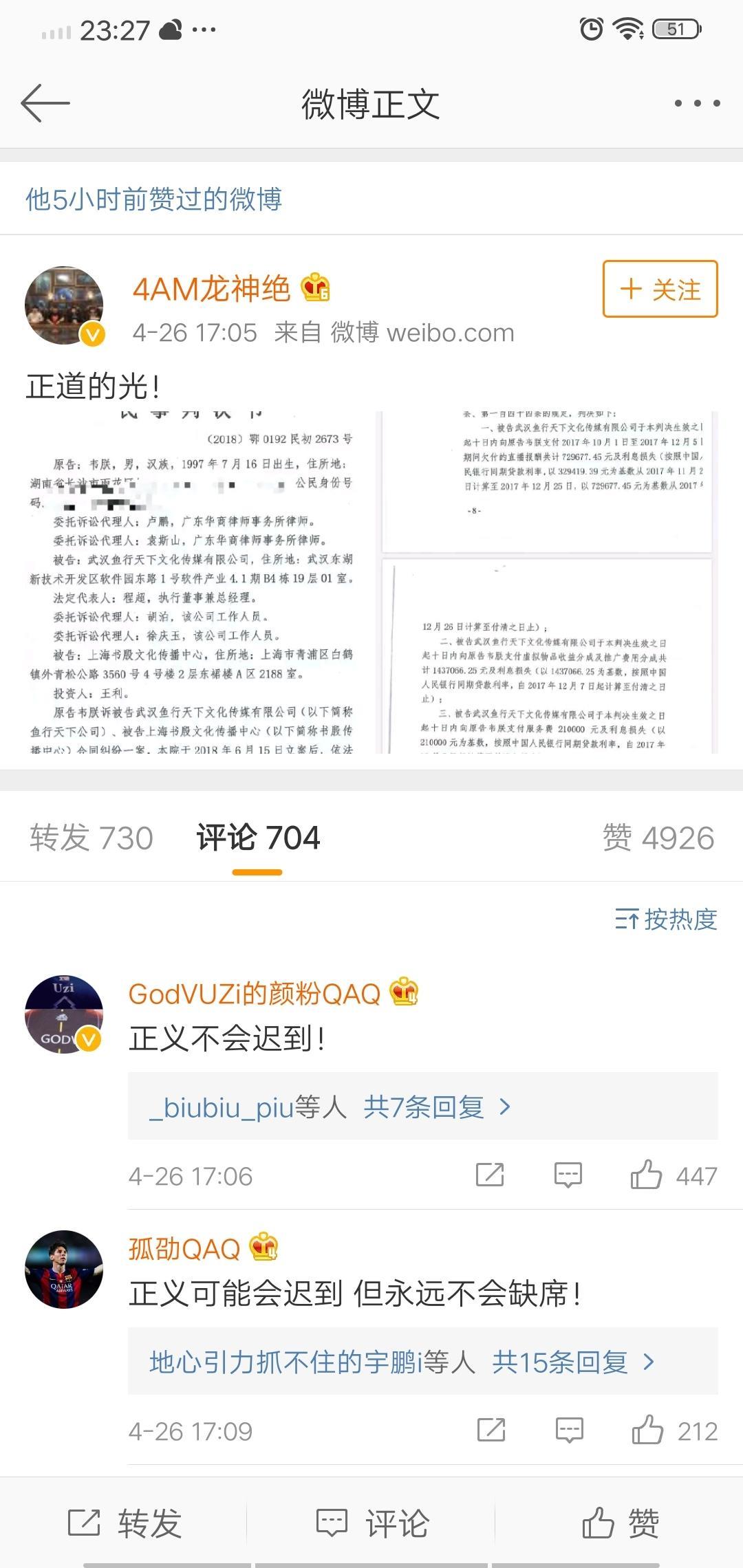 从判决书中我们可以看到,自从18年6月份立案后,经过两年的时间,该案判决斗鱼需要赔偿韦神的全部直播报酬以及收益分成,仔细一看,原来斗鱼已经拖欠了韦神这么多的工资,难怪当初要跳槽虎牙,而且4AM的龙神绝在微博中也是说到"正道的光",网友们也是表示祝贺,同时也有的网友表示在斗鱼的主场,没想到也能失败。
