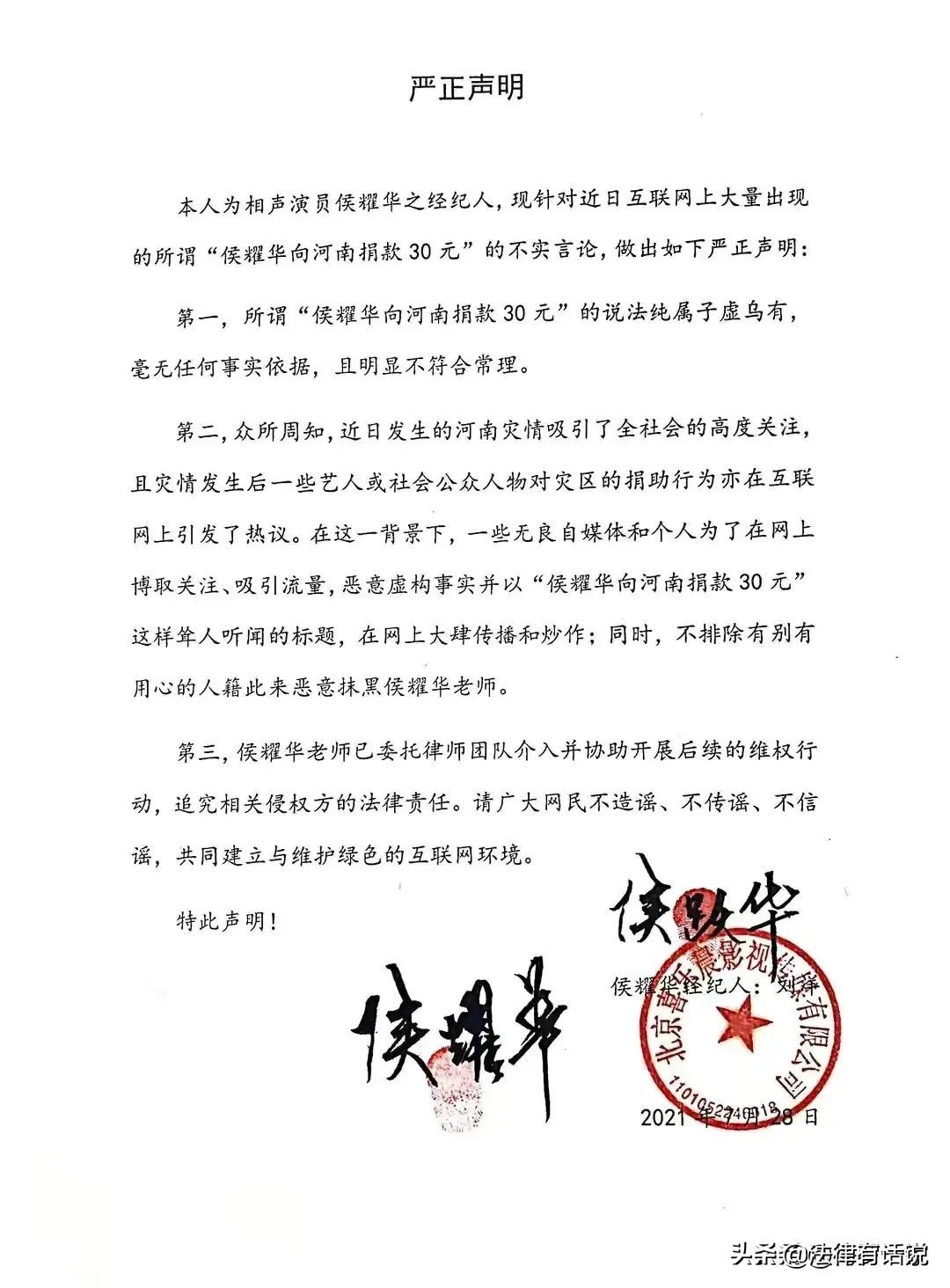 网传侯耀华捐款30元给河南,经纪人发严正声明辟谣,引争议