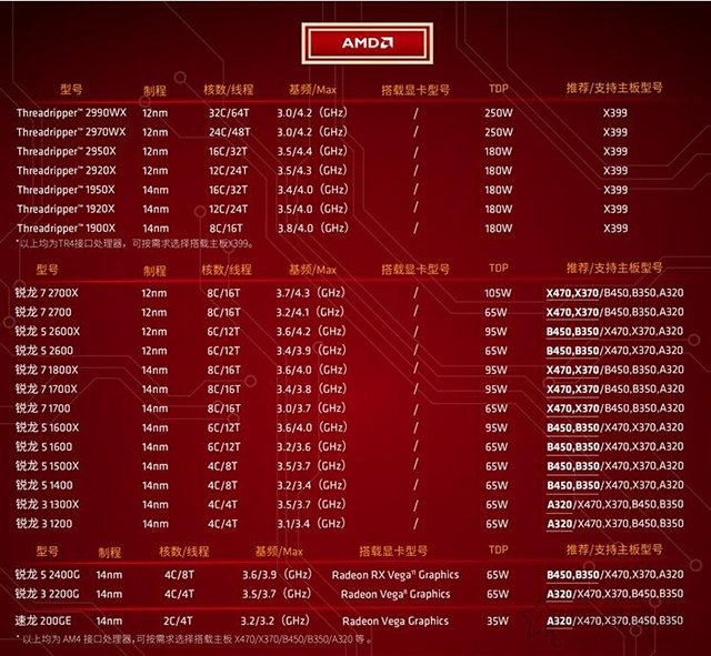 以下型号均为AMD锐龙第二代系列处理器,AMD锐龙二代CPU和主板搭配对照表如下: