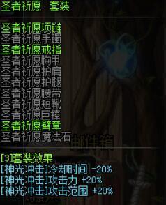 右边首饰呢我推荐大家带一件血色残阳手镯,项链辅助装备和戒指带异界3的圣者祈愿3件,圣者祈愿是加神光冲击技能范围和CD,有这3件加上兰总的6件一个图一个神光冲击清怪也是完全可以的