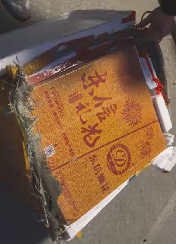 割开这个包裹的胶带和尼龙包装,里面是一个泡沫箱,打开后露出烟花箱,可见箱体上几个醒目大字“东信礼花”。产品的说明文字显示,这是一箱“16发东信礼花”,毛重21千克,总药量4768克,制造商是位于湖南浏阳市沿溪镇的东信烟花公司。