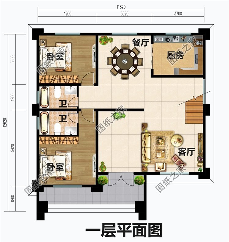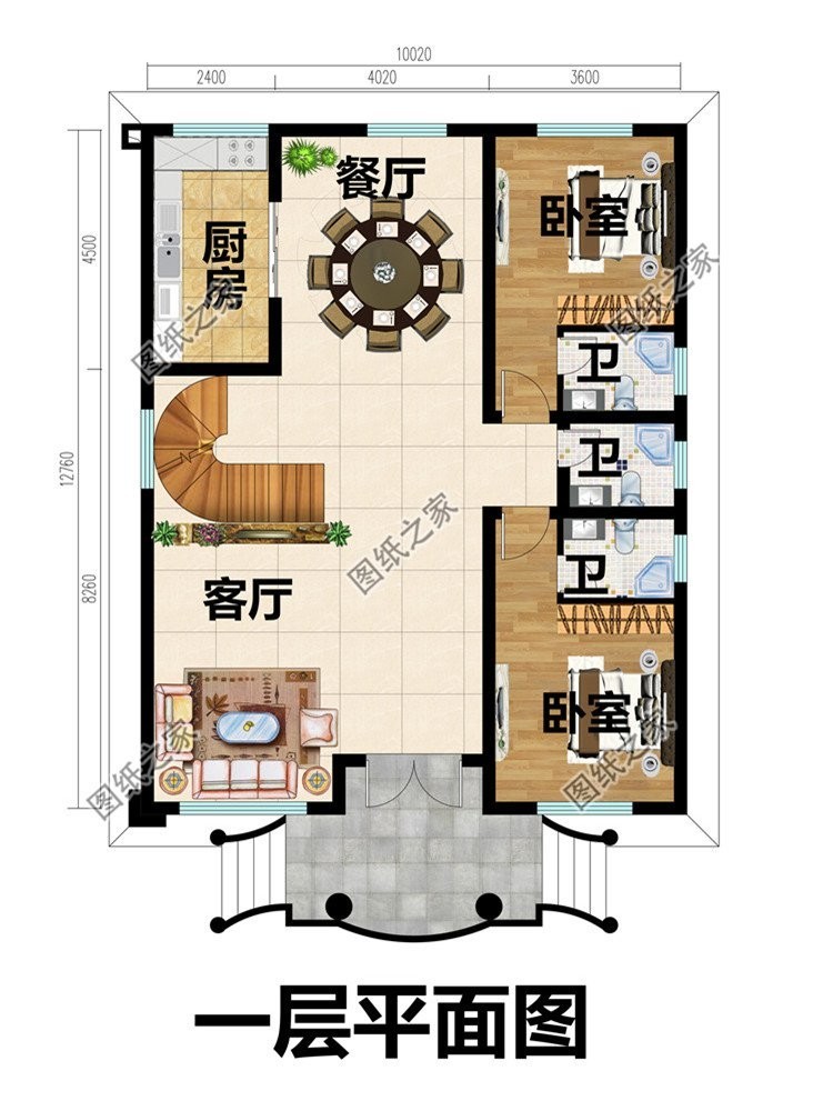 一层户型:客厅、土灶间、洗衣房、厨房、餐厅、卧室(带卫生间)、卧室、卫生间;