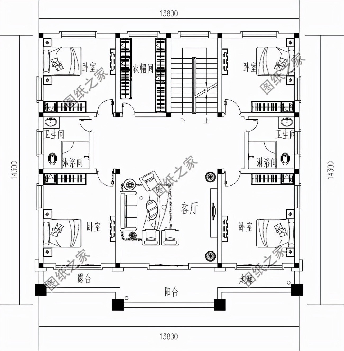 二层户型:客厅、卧室x4、衣帽间、卫生间x2、阳台、露台;