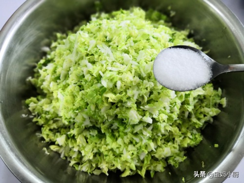 3,把圆白菜一片片掰下来,泡水洗净,然后用绞馅机绞碎成馅,倒入大盆里,加入2勺盐拌匀,再抓一抓,殺水8分钟;