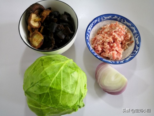 2,调馅。做馅的食材是中号的圆白菜,还有泡软洗净的黑木耳和小黄蘑,肥瘦猪肉馅有200克就够了,洋葱需要1/3个,提味用,有它就不用放大葱了,味道更香;