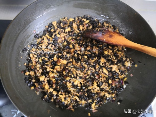 7,倒入木耳蘑菇馅,加盐调味,炒1分钟关火,离火晾凉备用;