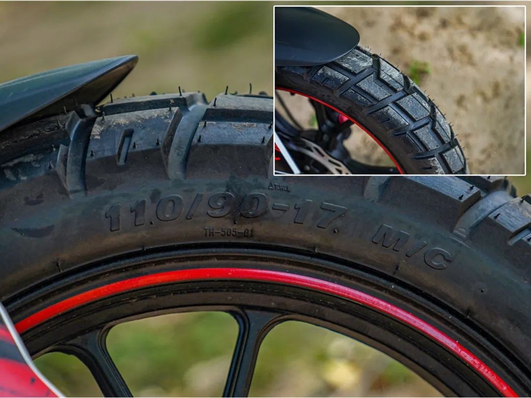 铁拳前轮胎规格为110/90 R17,后轮胎规格为130/80 R17,偏向非铺装路面的轮胎花纹令它在摩旅时更易脱困。