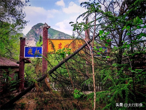 景区门前停车场上曾经的服务区域,人去楼空屋缺顶,门槛榆树当将军,萧条啊!