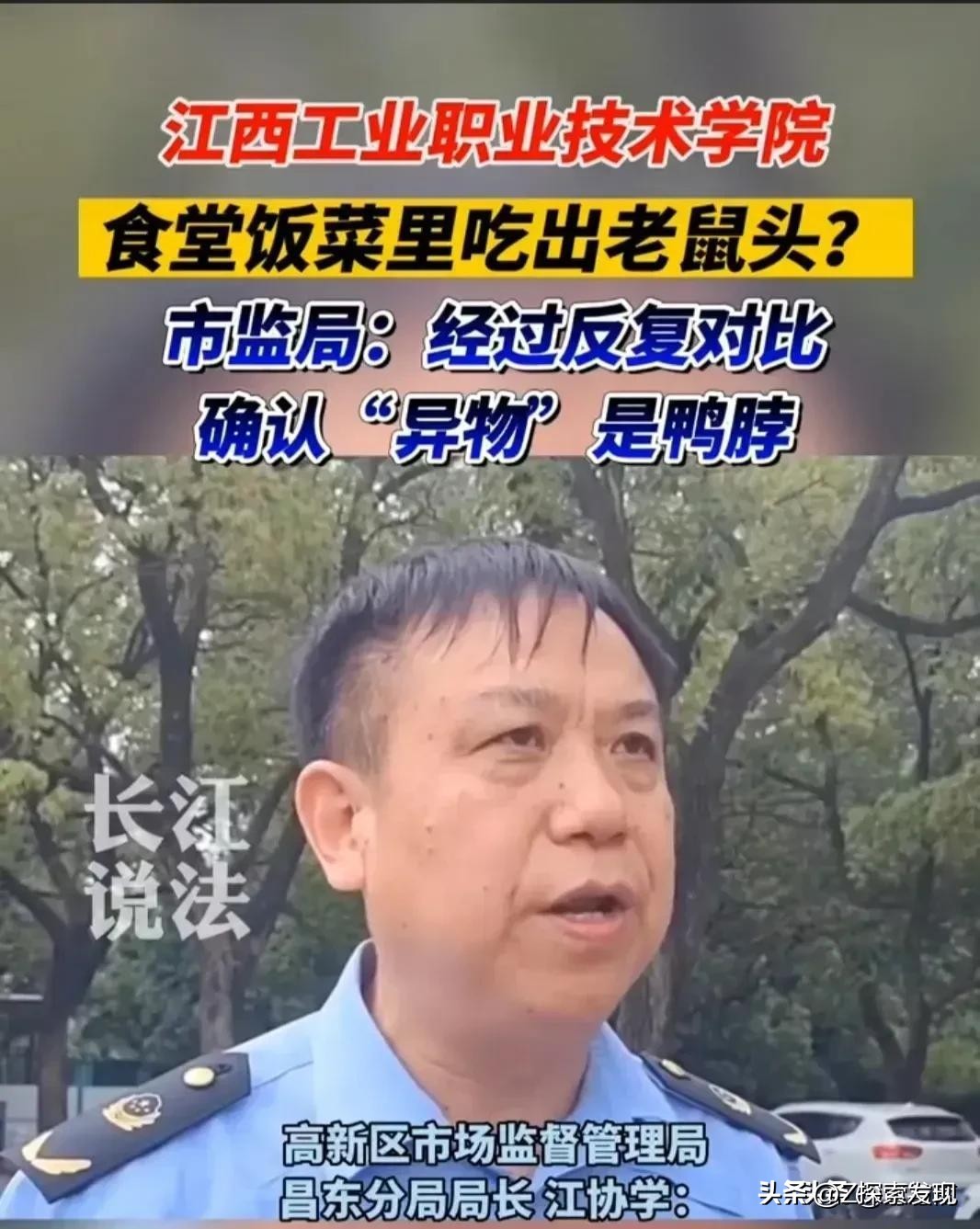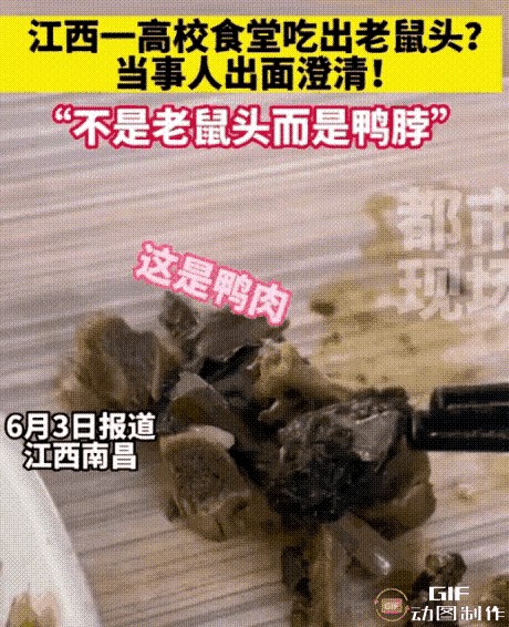 6月3日晚,江西工业职业技术学院官方微博发布情况通报,回应了此前引发争议的“学校食堂饭菜中吃出老鼠头”一事,称食堂菜品中的异物经当事人确认为鸭脖。通报还提到,南昌市高新区市场监督管理局接到情况报告后,第一时间派出执法人员到江西工业职业技术学院开展调查,问询学校工作人员、食堂负责人、当事学生及相关知情人,并对食品留样进行采样检测。目前检测结果尚未出来。