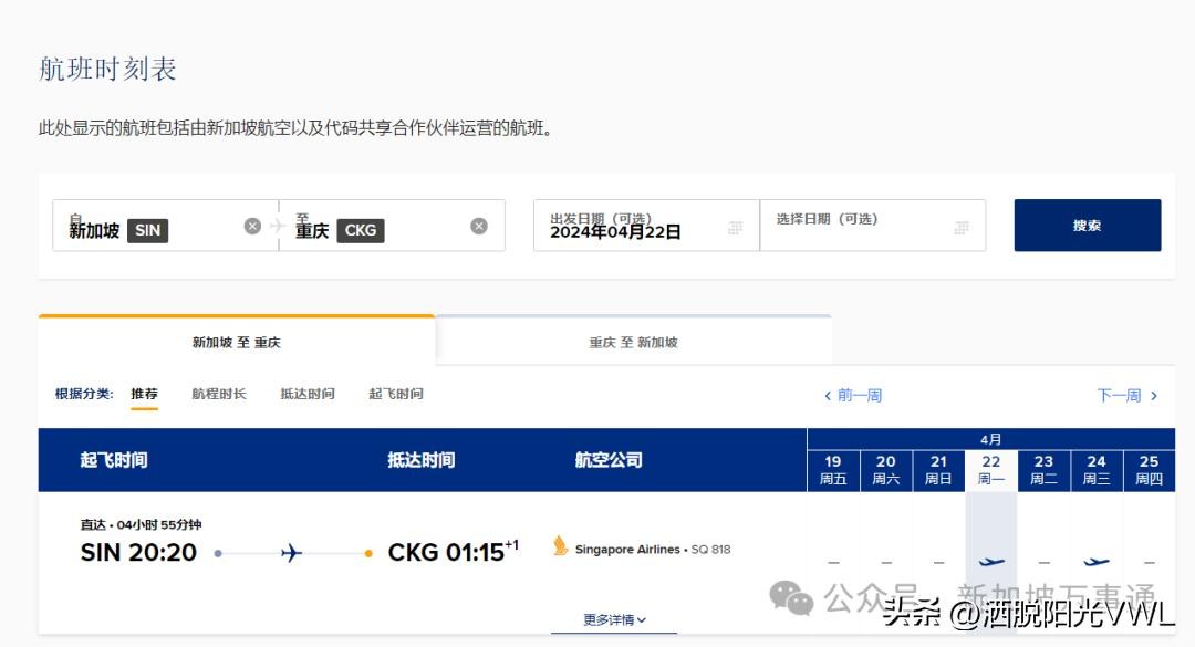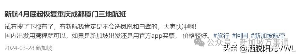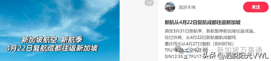 不少博主都在说:“新航恢复了4月份新加坡飞重庆、成都的航班”。