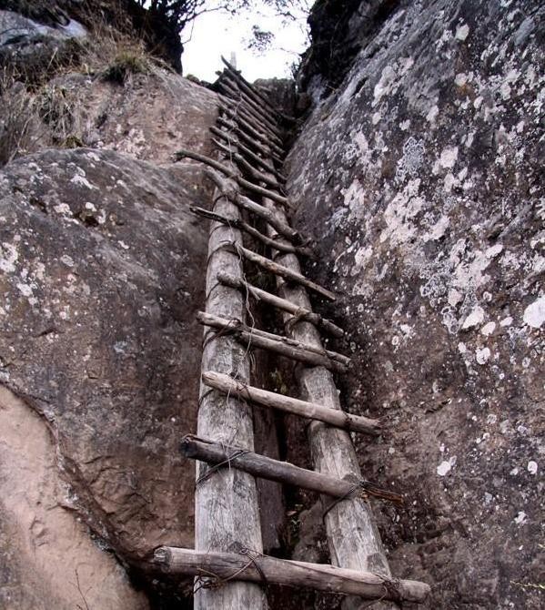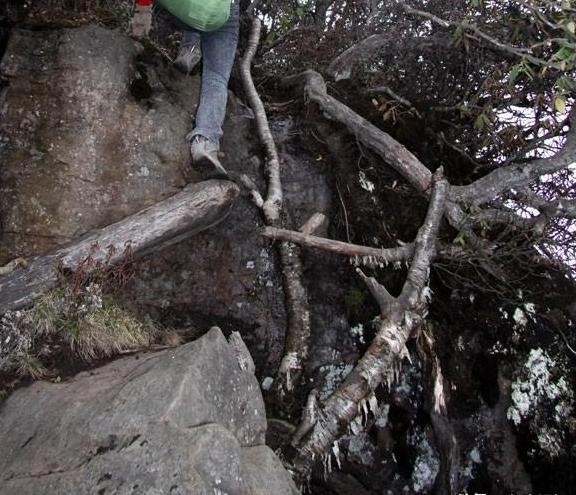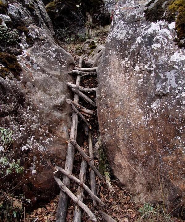 从这以后坡度基本都是70度以上,而且有些地方根本没有路,不知多少年以前山民上山采药用当地树木搭的楼梯多处已年久失修,腐烂变质,缺省松动十分危险,特别是“一线天”,下面一截没有木梯,要跪着爬上去,拽着一根摇晃的细铁丝,两山之间仅50厘米左右,缝隙只容一人通过,石壁上渗水,手冰凉根本拽不紧那摇晃的铁丝,而且空间狭小,背的帐篷如果碰上岩壁,不留神就将滑落万丈深渊,极难通过,上部嵌有一个木梯,湿滑腐朽,通过的要诀是手抓牢了脚再上,脚踩稳了手再攀。