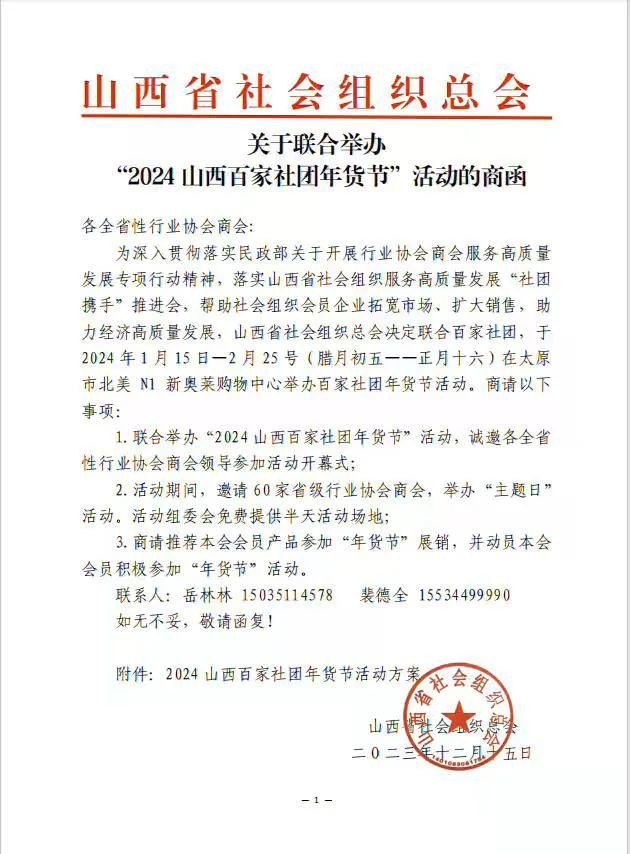 由山西省社会组织总会主办,山西省百家行业协会商会、《今日农业》杂志社、山西省会展行业协会协办,北美 N1 购物中心、山西晋绥人家餐饮管理有限公司承办的“2024 山西百家社团年货节”活动将于2024年1月15日至2月25日在北美N1新奥莱购物中心举办。