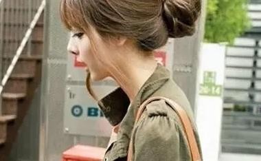 整齐的刘海凸显出一张精致的小脸来,而低扎的卷发花苞头就更加的甜美淑女呢,时尚好看两不误!