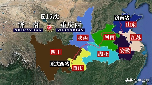 K15次列车运行线路图:山东济南开往重庆西,全程2052公里