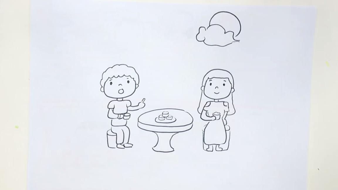 画法3:步骤①画上人物坐在石凳上吃月饼赏月的情景,画上月亮;
