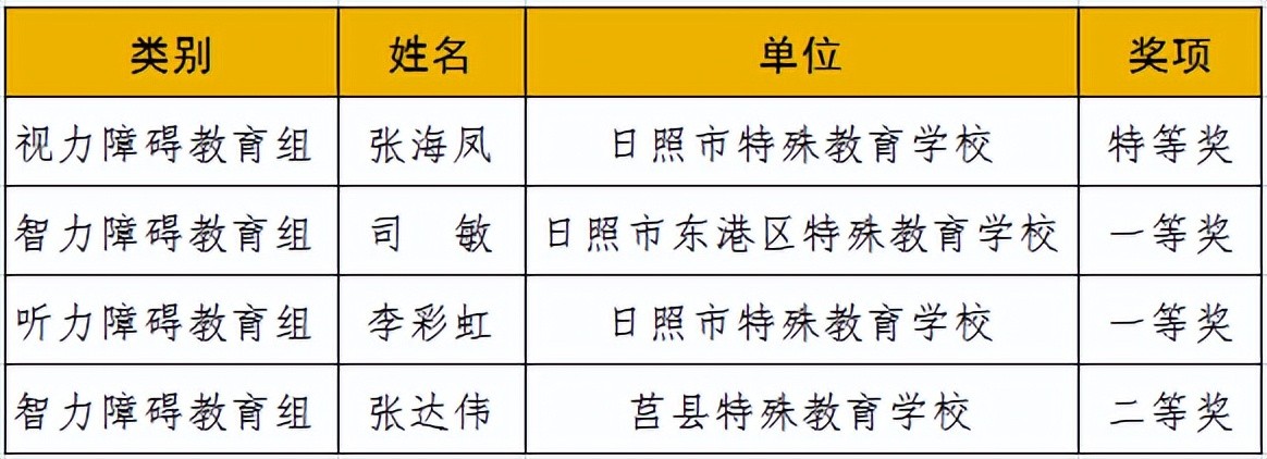 近日,省教育厅官网发布《关于第二届全省特殊教育教师基本功大赛获奖名单的公示》,经市级遴选、省赛评审等程序,我市参加比赛的12名教师中,有10名教师拟获奖,获奖率居全省前列。其中,特殊教育教师组——日照市特殊教育学校张海凤获特等奖、2名教师获一等奖、1名教师获二等奖;资源教师组——日照市东港区石臼小学唐新玫和莒县青岛路小学崔乃翠2名教师获特等奖、2名教师获一等奖、2名教师获二等奖。