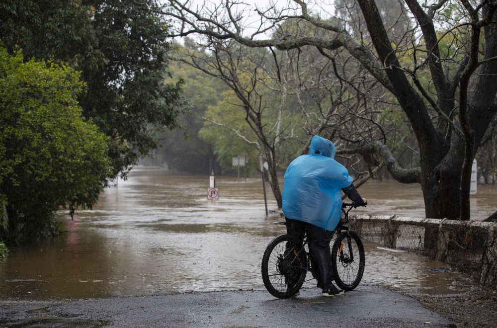 ↑7月4日,在澳大利亚新南威尔士州温莎,骑行者止步于被洪水淹没的道路。