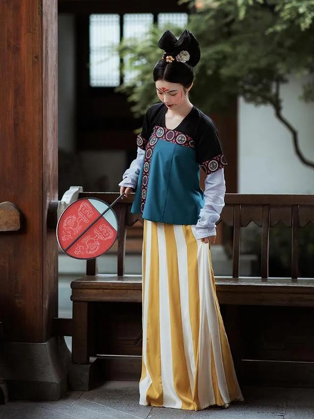 晋制汉服中的上衣称为襦,上襦最大的特点就是有“腰襕”,腰襕就是上襦衣摆的位置拼接出来的一块布,而上襦除了普通的长袖上襦外,还有充满时尚感的半袖上襦;