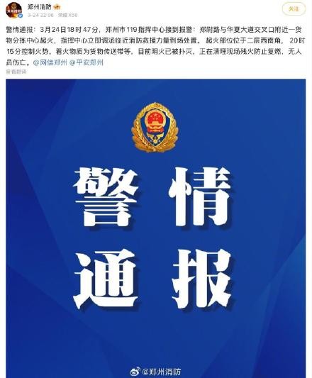 3月24日晚10时许,郑州市消防救援支队通报称,当天晚6时47分,郑尉路与华夏大道交叉口附近一货物分拣中心起火,指挥中心立即调派临近消防救援力量到场处置。起火部位位于二层西南角,晚上8时15分控制火势,着火物质为货物传送带等,明火已被扑灭,无人员伤亡。