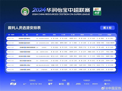 4月26日,中国足协公布中超第8轮裁判人员选派安排表。