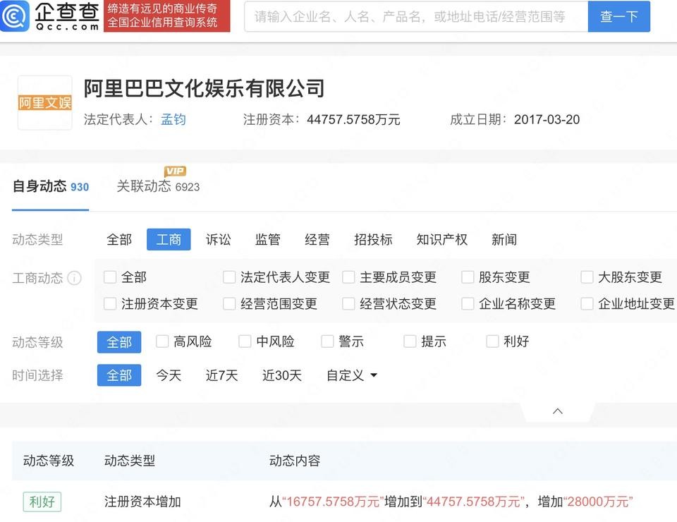 阿里文娱公司增资至4.48亿