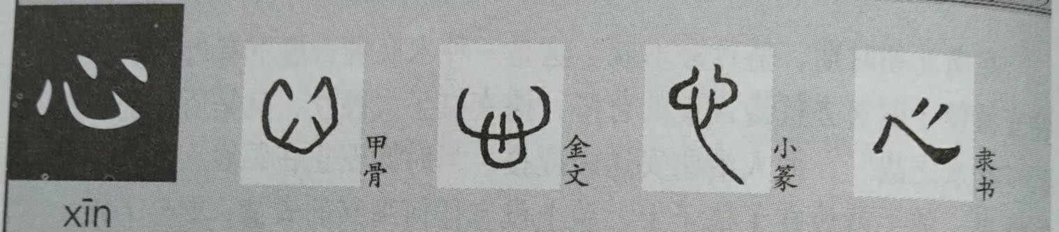 心,象形字,很像一颗心脏的样子。古人认为心是思维的器官,比如心里说,心想。因此与心有关的字或偏旁大都与思维有关,如思、想、念、感丶志、意等;心作左偏旁时为忄,情、怀、恼、悔等;心作下偏旁时,如恭、慕等。