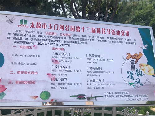 2玉门河公园 位于市区和平北路玉河街,走东2门(正门),也可走东1门,两门都在和平路上,离得不远,最近刚刚举办太原市第十三届荷花展。