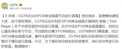 各位网友,很遗憾地通知大家,由于版权原因,CGTN无法对刘欣与FOX商业频道主播翠西·里根(Trish Regan)关于中美贸易的对话进行直播。此次对话在FOX商业频道播出,刘欣仅以嘉宾身份参与节目,节目版权归属于FOX电视台。CGTN原本打算直播,经过与FOX商业频道沟通,最终未获得节目授权。CGTN不能在没有得到对方授权的情况下擅自进行直播。不过,为了满足各位网友的信息需求,我们会对其进行实时报道。敬请期待!