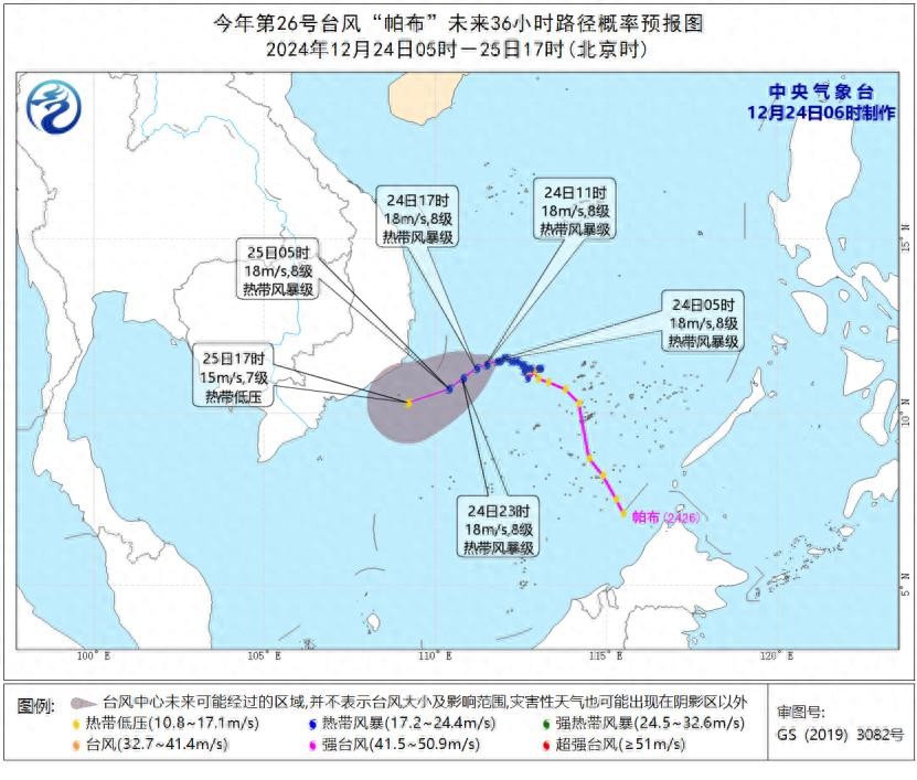 预计,“帕布”将以每小时5至10公里的速度向西偏南方向移动,强度变化不大,25日夜间将在越南南部近海海面逐渐减弱消散。