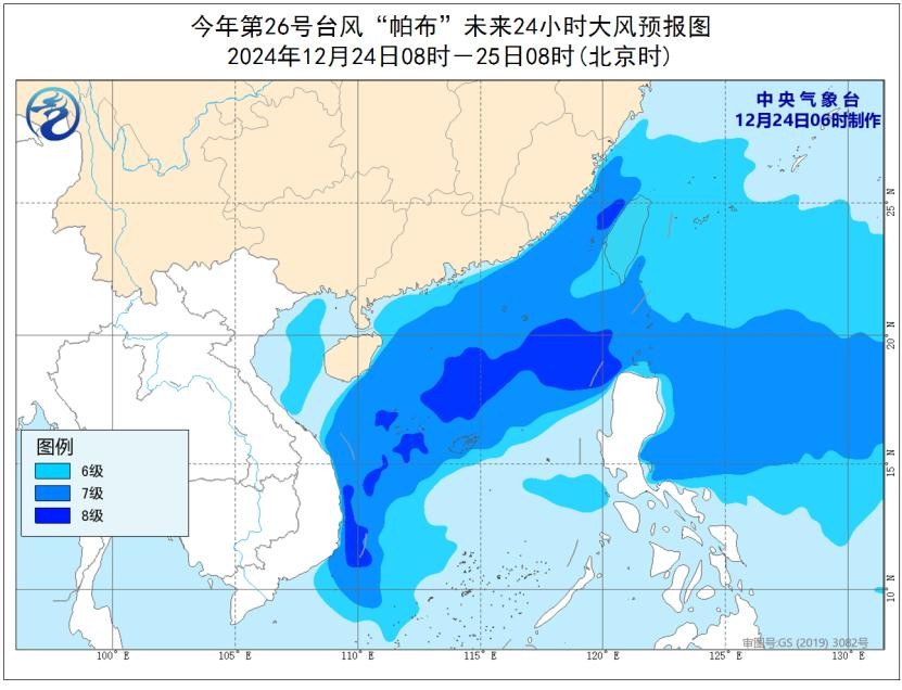 大风预报:24日8时至25日8时,受“帕布”和冷空气的共同影响,东海南部、台湾以东洋面、台湾海峡、巴士海峡、北部湾、南海大部以及福建沿海、台湾岛沿海、广东沿海、海南岛沿海将有6至7级大风,阵风8至9级,其中台湾海峡东部、南海北部和西部的部分海域以及西沙群岛附近海域风力有8级,阵风9至10级。