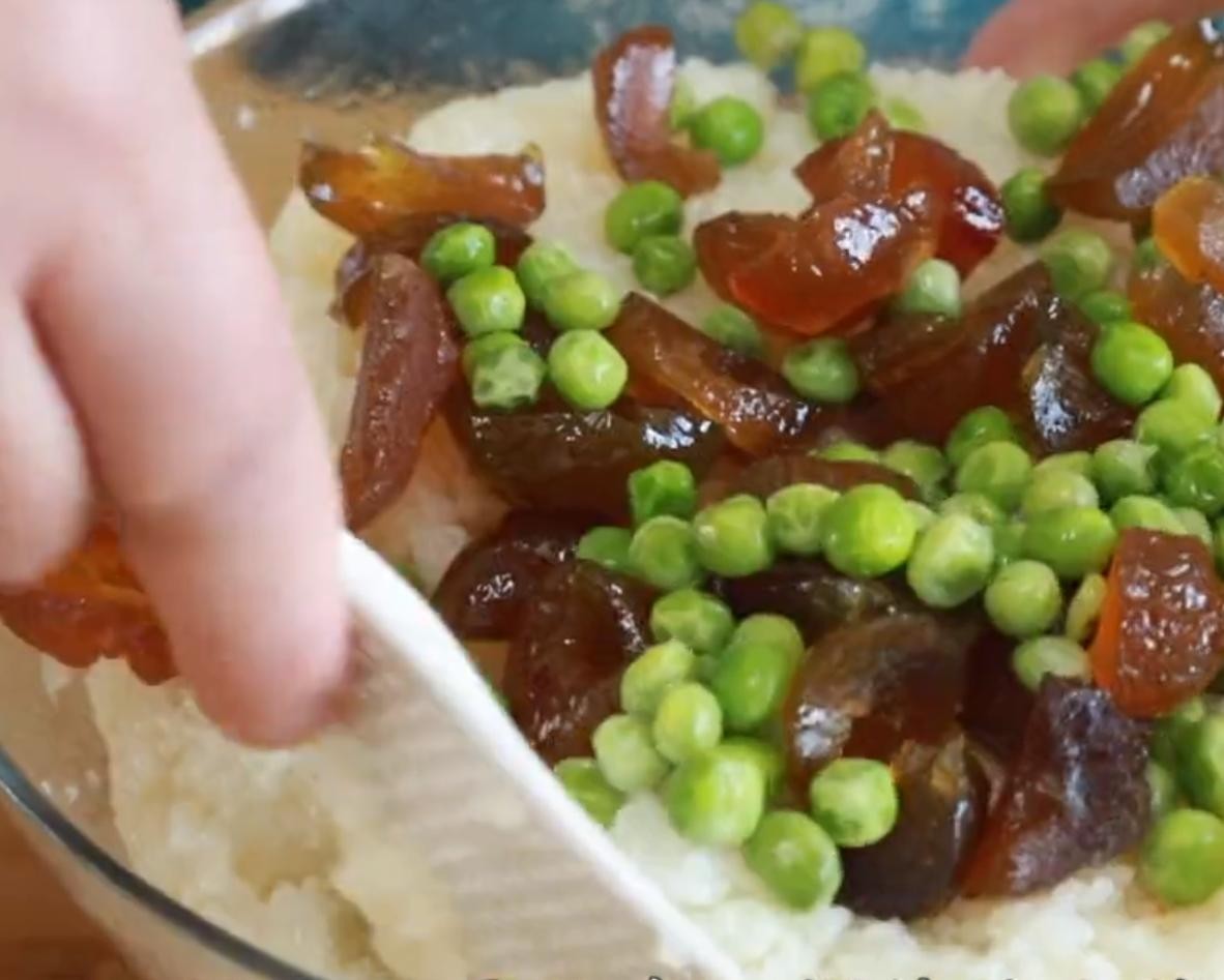 4,搅拌均匀后放上蜜枣和青豆搅拌均匀