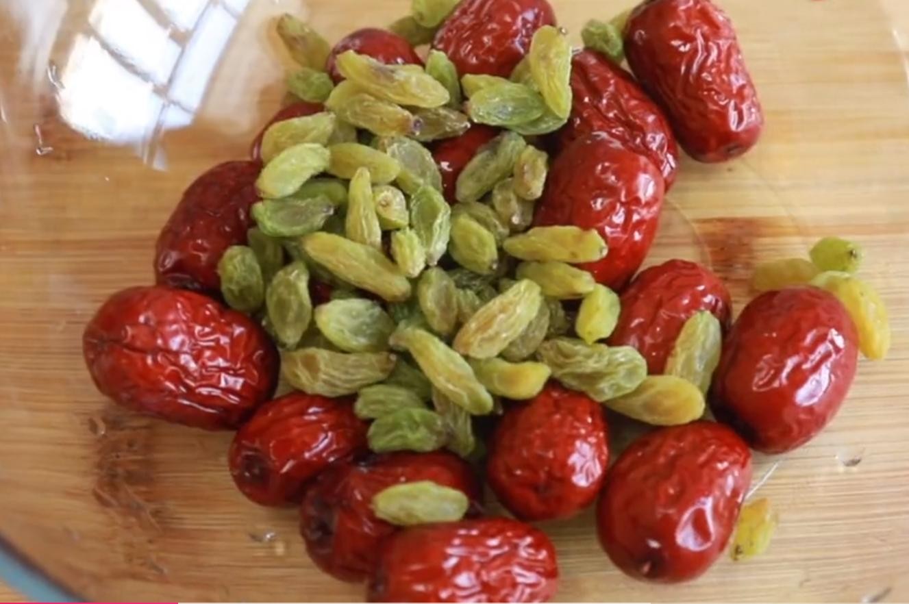 5,准备好大枣和葡萄干加入一勺面粉,抓搓后再用清水冲洗干净