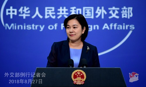 据外交部网站发布发言人表态《2018年8月27日外交部发言人华春莹主持例行记者会》,实录如下: