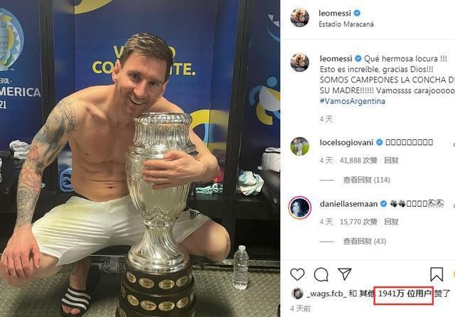 今年的美洲杯,梅西领衔的阿根廷队夺得冠军,而梅西也打破了自己无国家队大赛冠军的魔咒。赛后,梅西在Instagram表达了自己的喜悦。梅西在Instagram发的一条与美洲杯奖杯合影的帖子,点赞数已超过1941万人次,打破了Instagram体育类帖子的点赞人数纪录,而这条帖子下面还有近50万条评论。