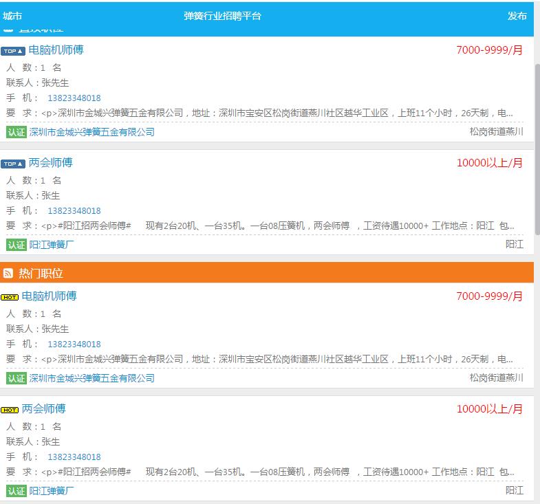 弹簧机师傅的招聘:目前都是业内介绍为主,其次是弹簧群、或者弹簧网发布信息、或者人才招聘网上发布招聘信息为主。弹簧调机师傅一般可能发布求职简历的网站是:三分钟弹簧网、斯普弹簧网、888弹簧网。查找弹簧师傅招聘群,到群里面发布信息,也是一个办法。但往往还是有熟人介绍的比较可靠。